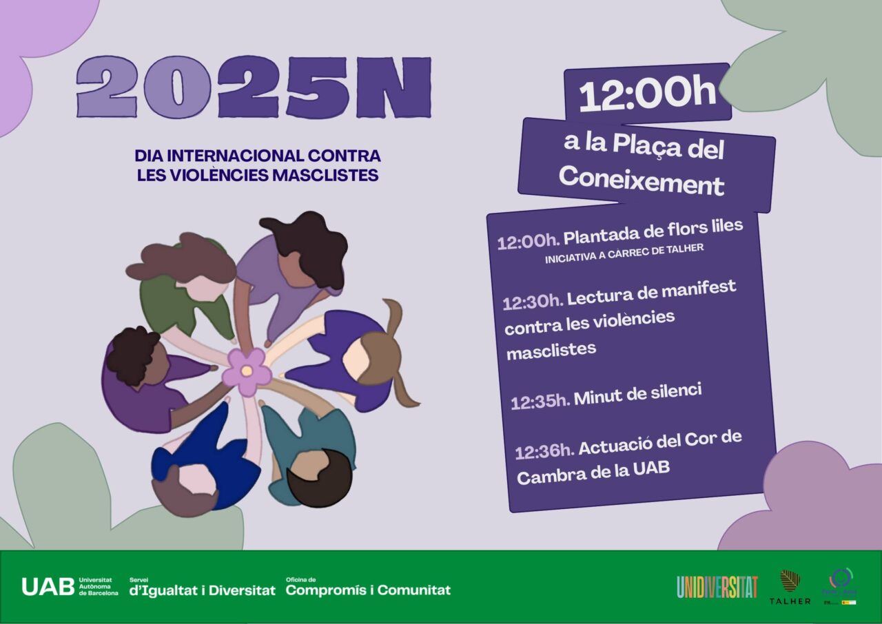 La UAB se suma a la commemoració del 25N amb l’espai de reflexió “Les violències masclistes dins la Universitat i noves mirades de justícia i comunitat”, a càrrec de l’entitat Fil a l’Agulla. Aquesta activitat s’emmarca dins dels tallers impulsats pel Servei d’Igualtat i Diversitat, anomenats “Els homes que volem ser”. L‘acte central és a la Plaça del Coneixement. L’esdeveniment inclou una plantada de flors liles, la lectura del manifest institucional per la secretària general, Esther Zapater, un minut de silenci en memòria de les víctimes i una actuació del cor de cambra de la UAB. Finalment, Diego Falconi Trávez imparteix la conferència “Noves/velles masculinitats per a repensar les maneres de ser home(s)”. Aquesta xerrada proposa estratègies per descompondre la masculinitat hegemònica.