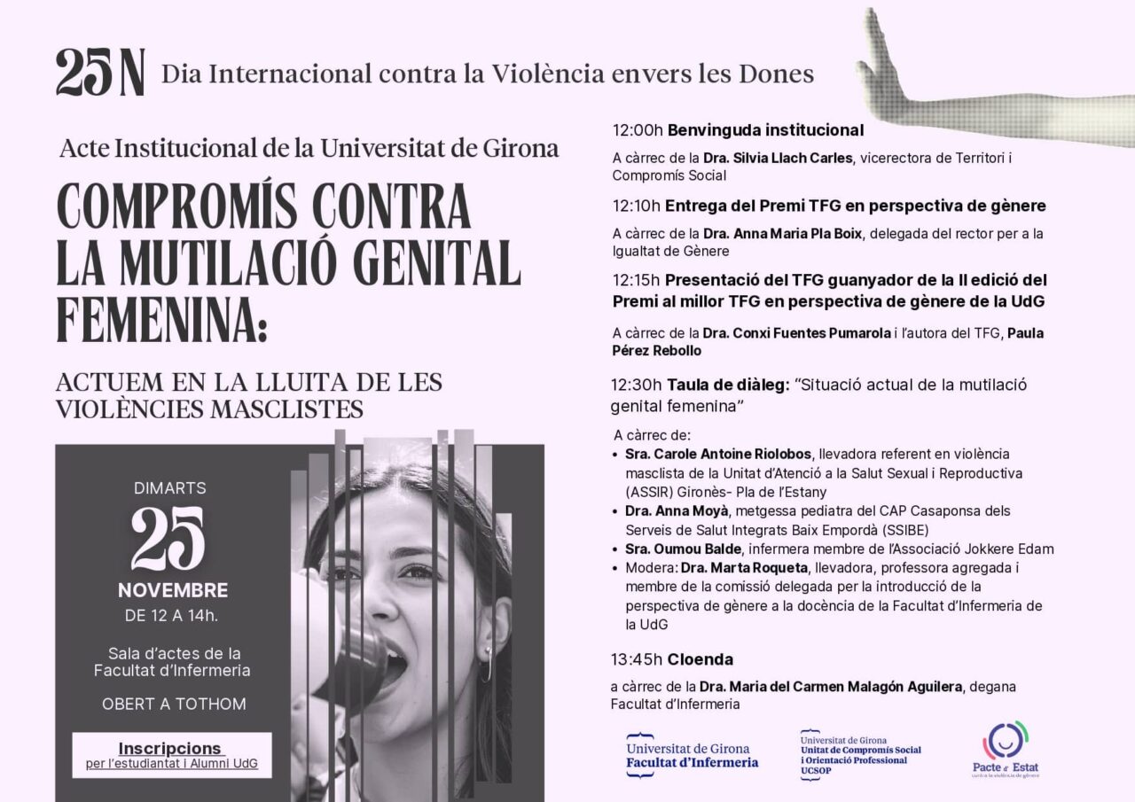 La Universitat de Girona (UdG) organitza un programa divers d’activitats en la lluita contra les violències masclistes, que abraça la sensibilització, la formació acadèmica i el debat. La programació inclou l’Acte Institucional sota el títol “Compromís contra la Mutilació Genital Femenina”, celebrat a la Facultat d’Infermeria. Pel que fa a la formació, s’ofereix la sessió virtual «Com aplicar la perspectiva de gènere en el TFG, TFM i Tesi Doctoral», amb l’objectiu de facilitar eines per a una recerca no androcentrista i interseccional, sota la direcció de les doctores Carme Valls i Llobet i Teresa Cabruja i Ubach. A més, s’impulsa un club de lectura per a PDI i PTGAS, centrat en l’obra «Alliberada» de Rosa Negre. D’altra banda, el professorat també ofereix Aules Obertes amb perspectiva de gènere, com ara “Anàlisi de polítiques públiques: les polítiques d’igualtat de gènere” i “Aportacions dels feminismes a les ciències polítiques” (a la Facultat de Dret) “El gènere en les Relacions Internacionals”, “El dret de família des d’una perspectiva de gènere” (Fac. Educació i Psicologia) i «Dones d’anunci» (Fac. Turisme).