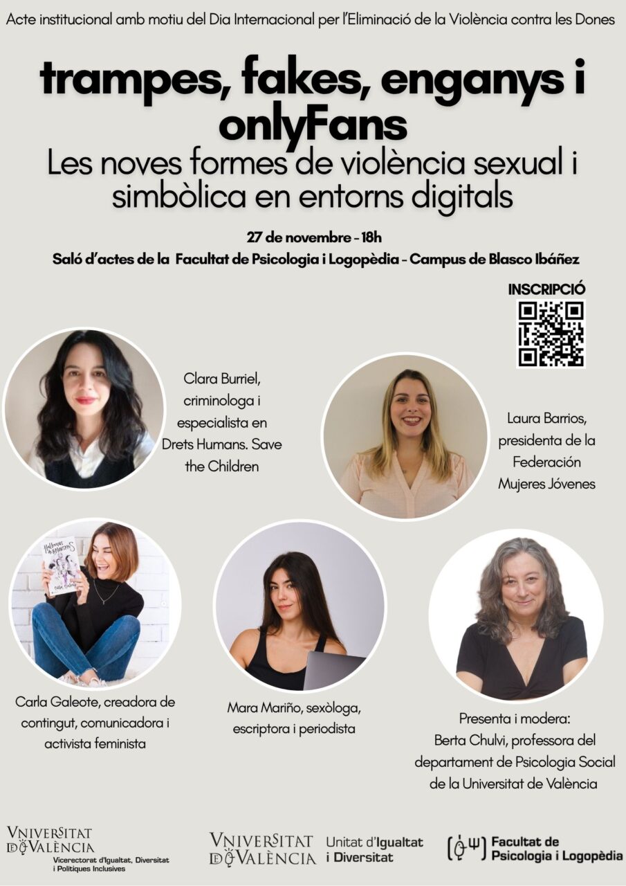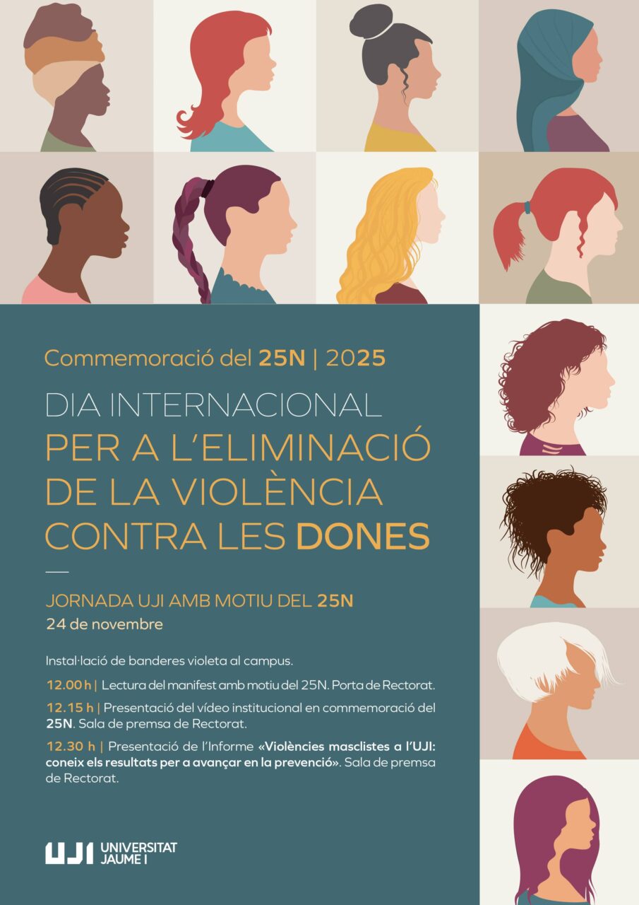 - Universitat de València (UV):La UV commemora el 25N amb una taula redona sobre les violències digitals «Trampes, fakes, enganys i OnlyFans». A més, s’han organitzat un ventall d’activitats en cada facultat amb exposicions com la d’Ana Veintimilla «A taula posada», cicle de seminaris com el de «Feminismes per al Dret», la sessió informativa «Recursos a disposició de les dones víctimes de violència sobre la dona», tallers com el de «Cos, cultura i drets humans: reflexions sobre la mutilació genital femenina» i arts performatives com l’obra de dansa«Estimar fins a trencar-se», etc. Finalment, com cada any, la UV s’adhereix al manifest elaborat per la Xarxa d’Unitats d’Igualtat per l’Excel·lènciea Universitària.