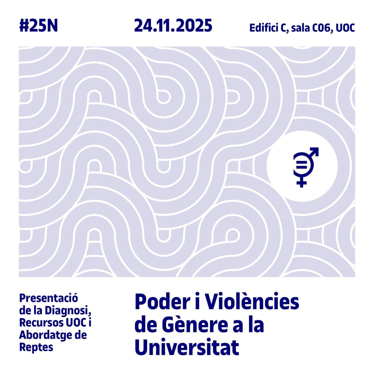 Per la seua banda, la UOC ha previst la jornada «Poder i Violències de Gènere a la Universitat«, amb l’objectiu de presentar els resultats de la diagnosi sobre violències masclistes realitzada entre el seu estudiantat. Aquesta jornada busca debatre sobre els reptes i les eines institucionals per a la prevenció i l’abordatge d’aquestes violències en l’àmbit universitari. Destaca la intervenció de Mariona Llobet (UPF) sobre els “Límits legals i conseqüències penals” i la ponència sobre «Prevenció digital i conductes antisocials» de Pablo Romero. La sessió conclou una taula de debat sobre l’abordatge i els reptes de les violències de gènere en l’entorn universitari.