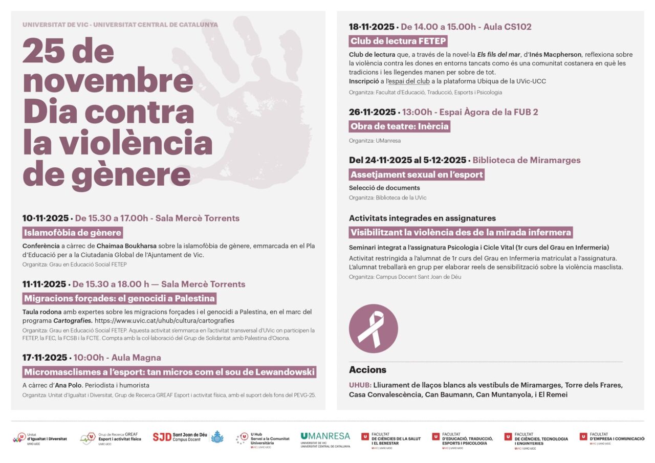 Per la seua banda, la UVic-UCC organitza diverses activitats dedicades a reflexionar i sensibilitzar sobre la violència de gèner en el marc del 25N. Entre aquestes activitats trobem conferències i tallers sobre islamofòbia, migracions forçades i el genodici de Palestina, i micromasclismes a l’esport. També s’ha dissenyat un club de lectura per reflexionar sobre la violència contra les dones a través de la novel·la «Els fils del mar», d’Inés Macpherson. A més, s’han realitzat una selecció de documents sobre assetjament sexual en l’esport i s’han realitzat un seminari adreçat a infermeria, amb l’objectiu d’elaborar reels de sensibilització sobre la violència masclista. Finalment, la universitat reparteix llaços blancs als vestíbuls de diversos edificis.