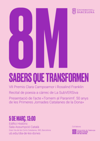 La UB se suma a la commemoració del 8 M amb un acte institucional anomenat “Sabers que transformen” que comptarà amb l’entrega dels VII Premis Clara Campoamor i Rosalind Franklin, un recital de poesia a càrrec de La SubVERSiva i la presentació de l’acte “Tornem al Paranimf. 50 anys de les Primeres Jornades Catalanes de la Dona“.